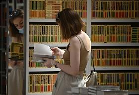 Жанровая фотография. Покупательница в медицинской маске в книжном магазине.