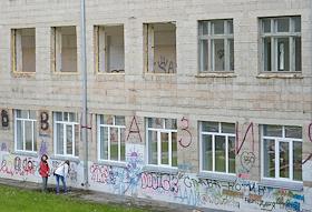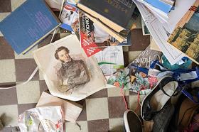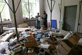 Виды Новосибирска и Новосибирской области. Жанровая фотография. Начало сноса старого здания гимназии №3 в Академгородке Новосибирска. Разбросанные учебники на полу.