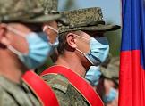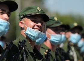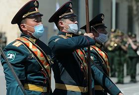 Репетиция Парада Победы, посвященного 75-годовщине Победы в Великой Отечественной войне. Жанровая фотография. Военнослужащие в медицинских масках во время репетиции.