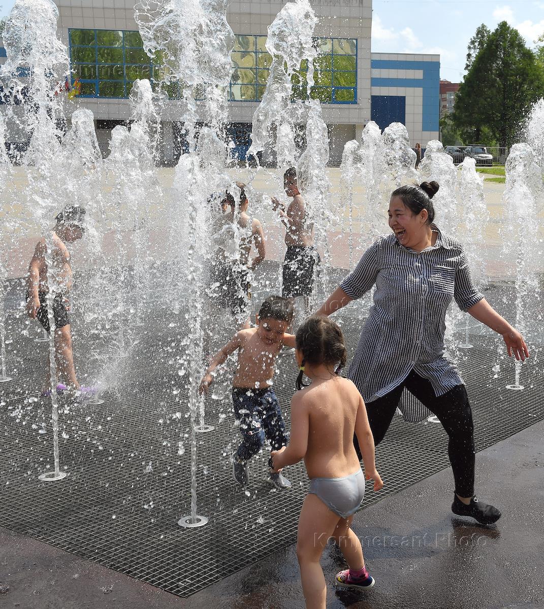 Отмена режима самоизоляции из-за опасности распространения коронавирусной инфекции COVID-19 в Москве. Жанровая фотография. Дети и родители купаются в фонтане в Авиационном районе.