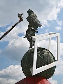 Виды Москвы. Жанровая фотография. Профилактическая помывка скульптуры гладиатора у стадиона "Открытие Арена".