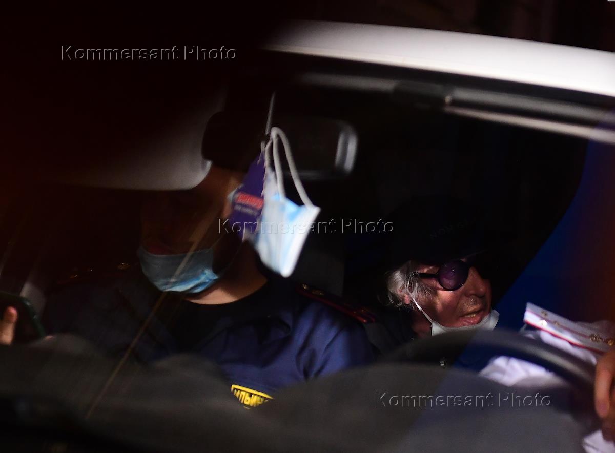 Ситуация у дома актера Михаила Ефремова. Актер Михаил Ефремов (справа) после заседания Таганского районного суда, на котором ему избрана мера пресечения в виде домашнего ареста на два месяца до 9 августа. Накануне Михаил Ефремов, находившийся за рулем автомобиля Jeep Grand Cherokee, выехал на полосу встречного движения и столкнулся с фургоном. Водитель автомобиля, в который въехал джип Ефремова, пострадал, его госпитализировали. Позже в больнице пострадавший скончался. Ефремова доставили на экспертизу, которая показала наличие алкоголя в крови.
