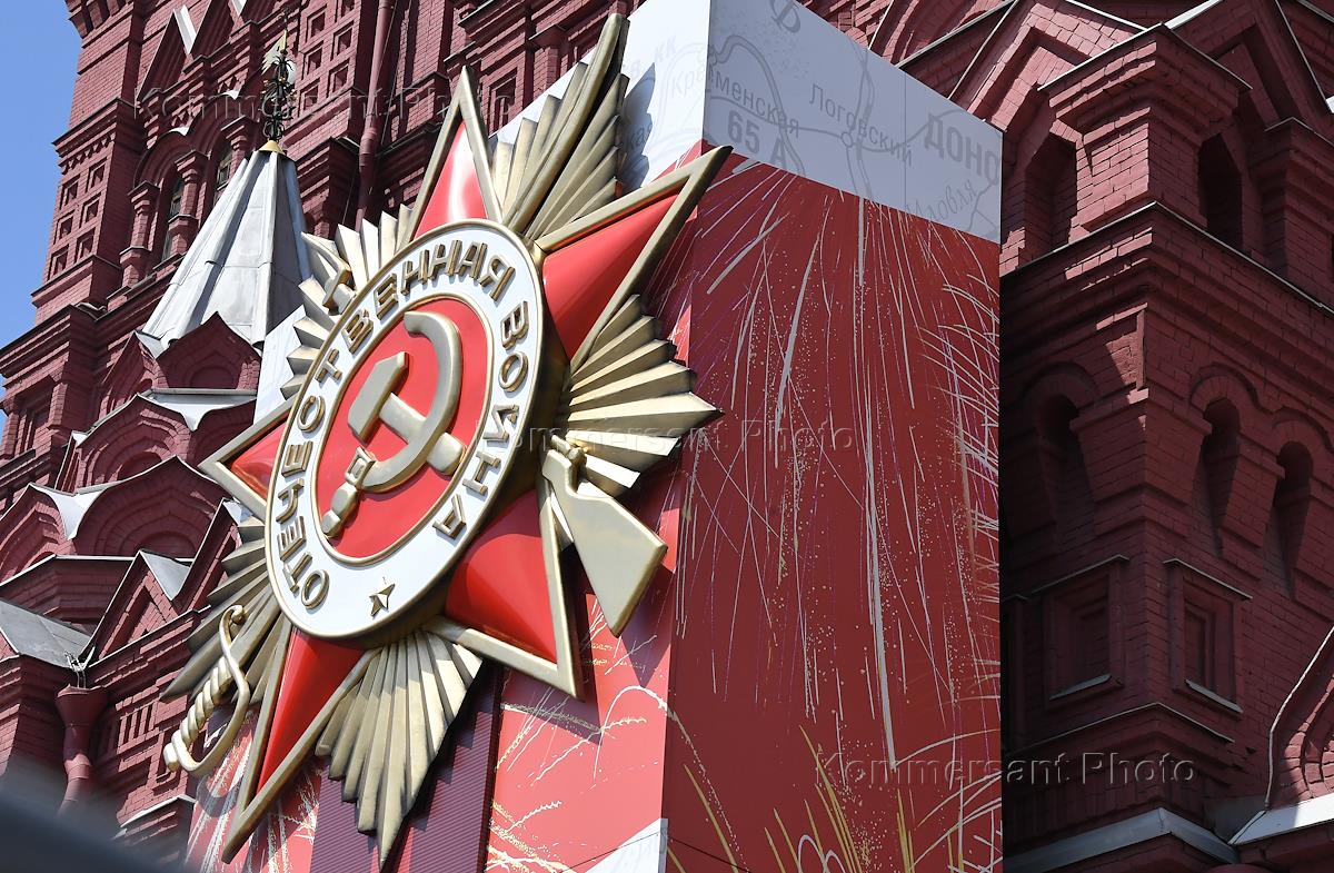 Отмена режима самоизоляции из-за опасности распространения коронавирусной инфекции COVID-19 в Москве. Жанровая фотография. Подготовка к параду Победы, посвященного 75-й годовщине Победы в Великой Отечественной войне. Монтаж сцены и трибуны для зрителей на Красной площади.