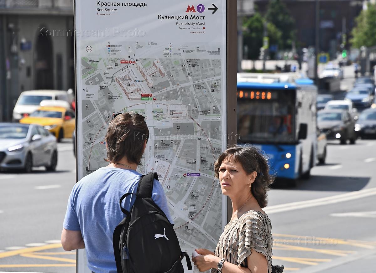 Отмена режима самоизоляции из-за опасности распространения коронавирусной инфекции COVID-19 в Москве. Жанровая фотография. Мужчина и женщина перед картой-схемой расположения улиц.