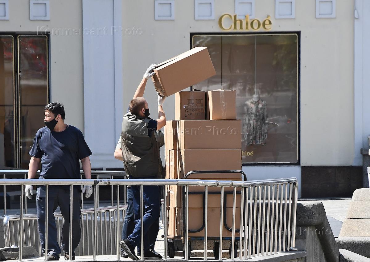 Отмена режима самоизоляции из-за опасности распространения коронавирусной инфекции COVID-19 в Москве. Жанровая фотография. Грузчики в медицинских масках укладывают коробки на тележку.