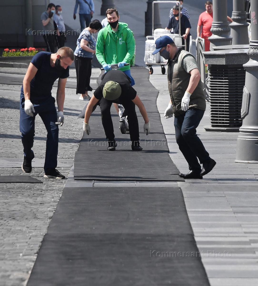 Отмена режима самоизоляции из-за опасности распространения коронавирусной инфекции COVID-19 в Москве. Жанровая фотография. Рабочие в медицинских масках во время укладки серой дорожки на тротуарную плитку.