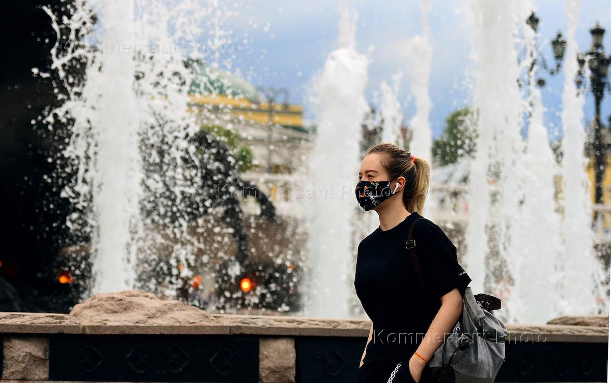 Отмена режима самоизоляции из-за опасности распространения коронавирусной инфекции COVID-19 в Москве. Жанровая фотография. Девушка в медицинской маске на фоне фонтана "Четыре времени года" на Манежной площади.