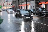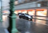 Отмена режима самоизоляции из-за опасности распространения коронавирусной инфекции COVID-19 в Москве. Жанровая фотография. Автомобиль на дороге во время дождя.