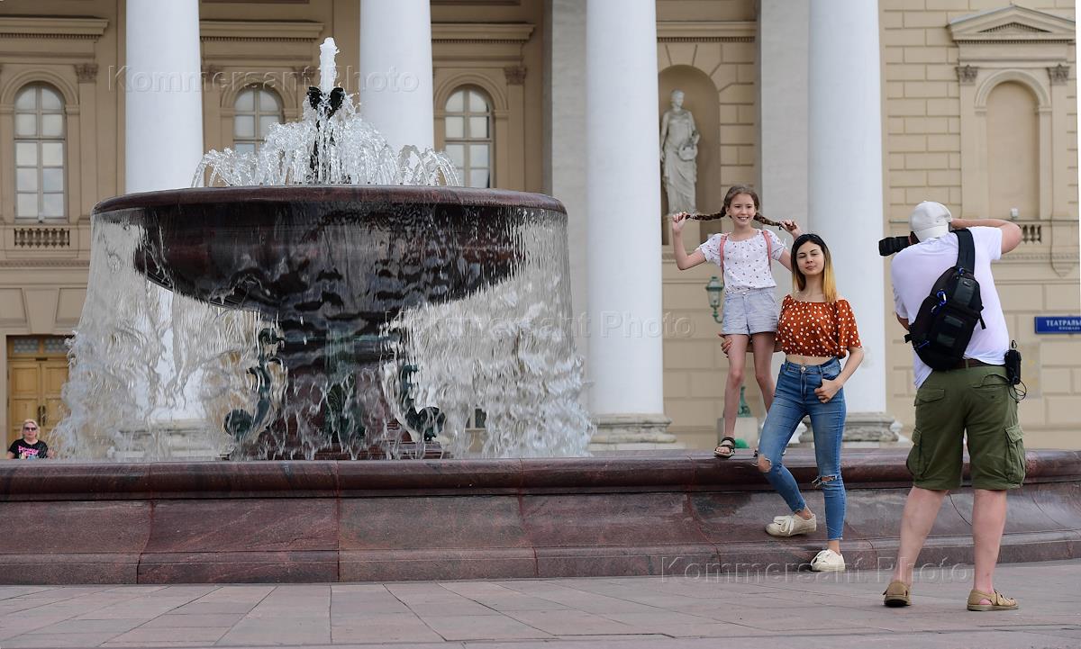 Отмена режима самоизоляции из-за опасности распространения коронавирусной инфекции COVID-19 в Москве. Жанровая фотография. Молодые люди фотографируются на фоне фонтана на площади перед зданием Государственного академического Большого театра.