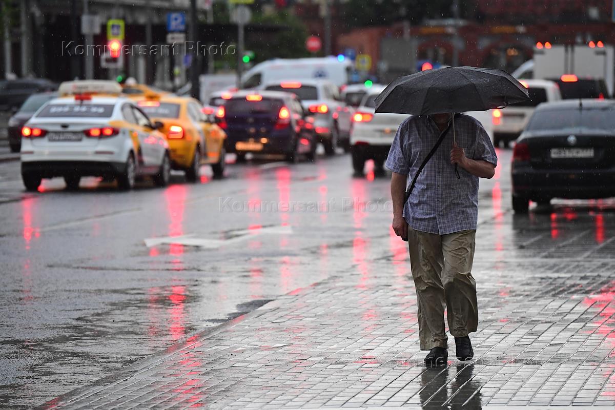 Отмена режима самоизоляции из-за опасности распространения коронавирусной инфекции COVID-19 в Москве. Жанровая фотография. Прохожий с зонтом на улице.