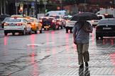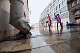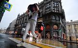 Отмена режима самоизоляции из-за опасности распространения коронавирусной инфекции COVID-19 в Москве. Жанровая фотография. Прохожие во время дождя.