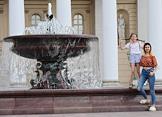 Отмена режима самоизоляции из-за опасности распространения коронавирусной инфекции COVID-19 в Москве. Жанровая фотография. Две девушки у фонтана на площади перед зданием Государственного академического Большого театра.