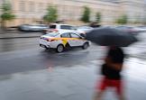 Отмена режима самоизоляции из-за опасности распространения коронавирусной инфекции COVID-19 в Москве. Жанровая фотография. Автомобиль "Яндекс. Такси" на дороге во время дождя.