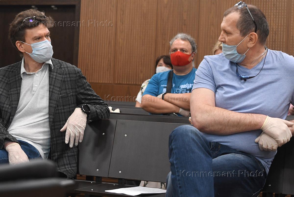 General Director and shareholder of AO T-Platforms Vsevolod Opanasenko (second from right) and Former Head of the Directorate of Communications of Russian Ministry of the Interior's Information Technology Department Alexander Alexandrov (second from left) attend the hearing in the Meshchansky District Court.