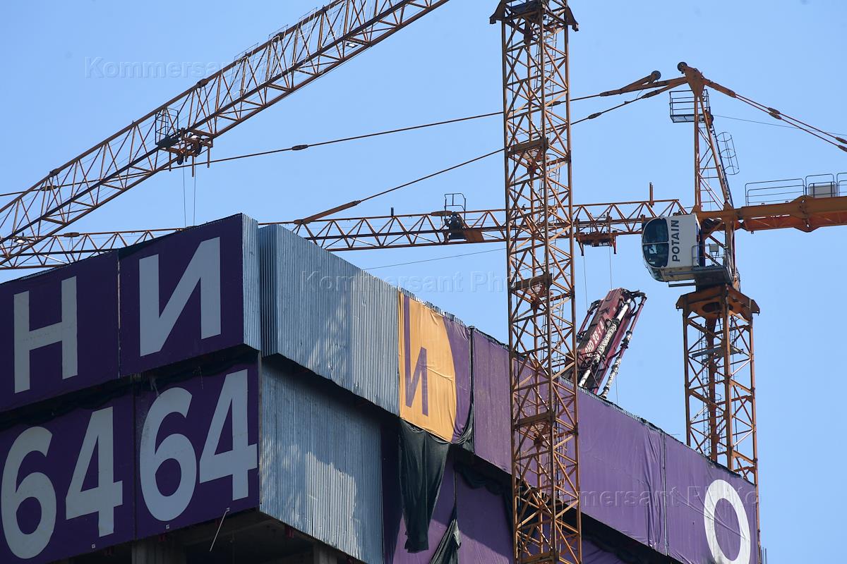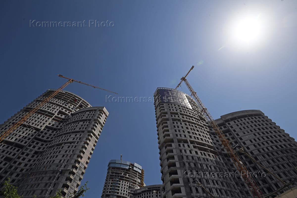 Москва после отмены режима самоизоляции из-за опасности распространения коронавирусной инфекции COVID-19. Жанровая фотография. Строительство жилого дома.