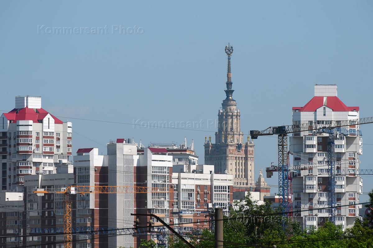 Жанровая фотография. Стрелы кранов на фоне многоэтажных жилых домов и здание Московского государственного университета (МГУ) имени М. В. Ломоносова.