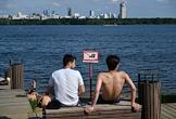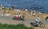 Москва после отмены режима самоизоляции из-за опасности распространения коронавирусной инфекции COVID-19. Жанровая фотография. Пляжи Строгино. Отдыхающие на берегу Москвы-реки.