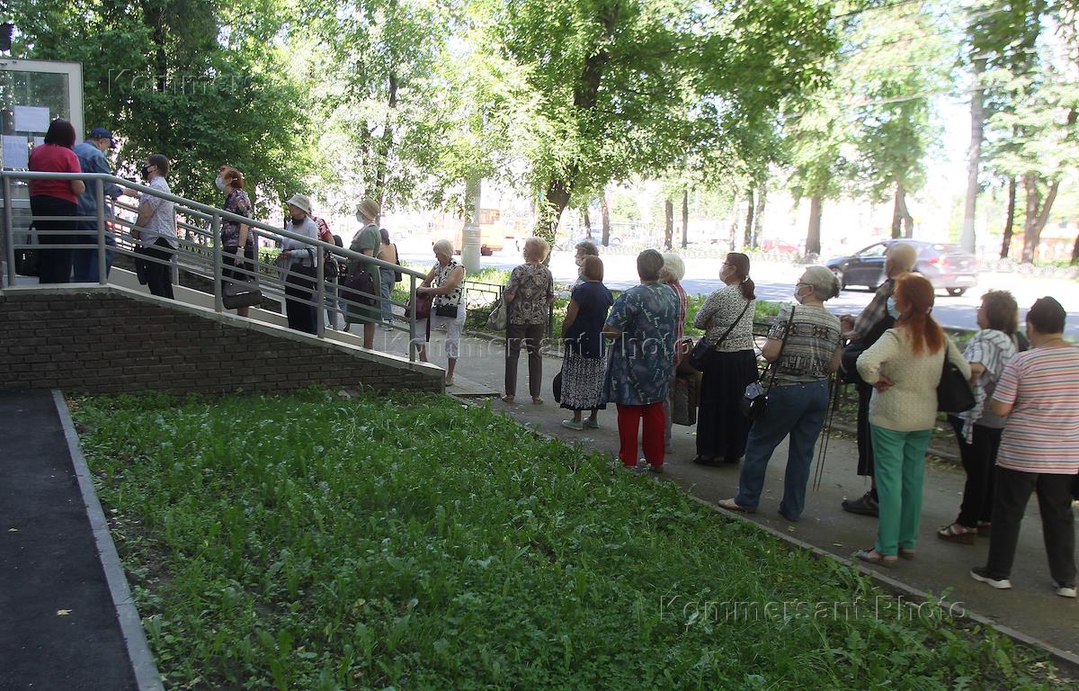 Очередь пенсионеров в пункт компании "Ситикард", ожидающих разблокировки транспортных карт после режима самоизоляции.
