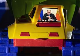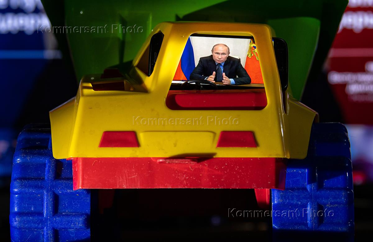 Президент России Владимир Путин провел в режиме видеоконференции совещание о реализации мер поддержки экономики и социальной сферы. Жанровая фотография. Совещание на экране мобильного телефона и детская игрушка.