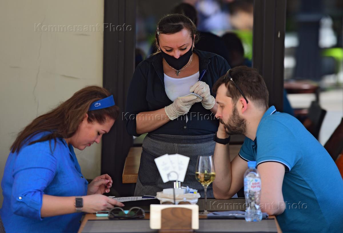 Снятие ограничений после режима самоизоляции из-за опасности распространения коронавирусной инфекции COVID-19. Жанровая фотография. Посетители летней веранды кафе.
