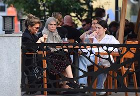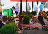 Снятие ограничений после режима самоизоляции из-за опасности распространения коронавирусной инфекции COVID-19. Жанровая фотография. Посетители летней веранды кафе.