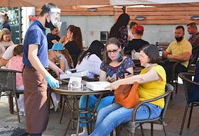 Снятие ограничений после режима самоизоляции из-за опасности распространения коронавирусной инфекции COVID-19. Жанровая фотография. Официант летней веранды кафе.