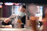 Снятие ограничений после режима самоизоляции из-за опасности распространения коронавирусной инфекции COVID-19. Жанровая фотография. Повар кафе торгового центра "Депо" в медицинской маске.