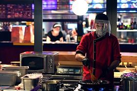 Снятие ограничений после режима самоизоляции из-за опасности распространения коронавирусной инфекции COVID-19. Жанровая фотография. Повар ресторана в торговом центре "Депо" в медицинской маске и защитном экране на лице во время приготовления еды.