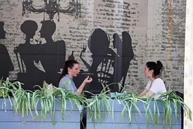 Снятие ограничений после режима самоизоляции из-за опасности распространения коронавирусной инфекции COVID-19. Жанровая фотография. Рабочие во время покраски летней веранды кафе.