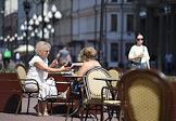 Снятие ограничений после режима самоизоляции из-за опасности распространения коронавирусной инфекции COVID-19. Жанровая фотография. Посетители на летней веранде кафе.