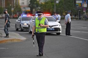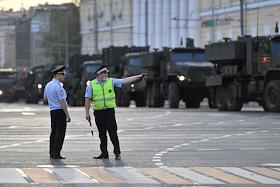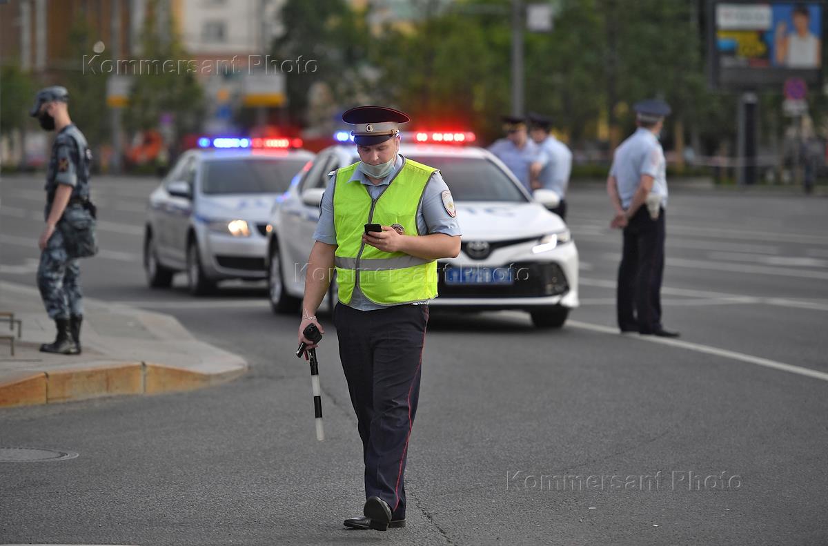Репетиция парада на Красной площади, посвященного 75-й годовщине Победы в Великой Отечественной войне. ЖАнровая фотография. Сотрудники полиции во время проезда военной техники в районе улицы Красная Пресня.