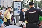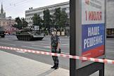 Репетиция парада на Красной площади, посвященного 75-й годовщине Победы в Великой Отечественной войне. Прохожие перед сотрудником полиции у перекрытого подземного перехода в районе проезда военной техники перед репетицией парада.