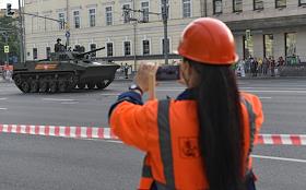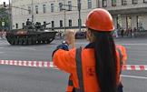 Репетиция парада на Красной площади, посвященного 75-й годовщине Победы в Великой Отечественной войне. Жанровая фотография. Сотрудница коммунальных служб фотографирует на мобильный проезд военной техники в районе улицы Красная Пресня.