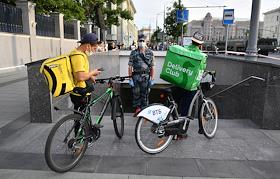 Репетиция парада на Красной площади, посвященного 75-й годовщине Победы в Великой Отечественной войне. Курьеры службы доставки еды компании Delivery Club и "Яндекс.Еда" перед военнослужащим у перекрытого подземного перехода в районе проезда военной техники перед репетицией парада.