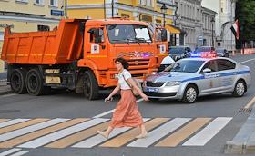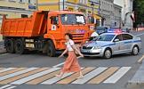 Репетиция парада на Красной площади, посвященного 75-й годовщине Победы в Великой Отечественной войне. ДОрожная техника и автомобиль полиции во время перекрытия улицы в районе проезда военной техники перед репетицией парада.