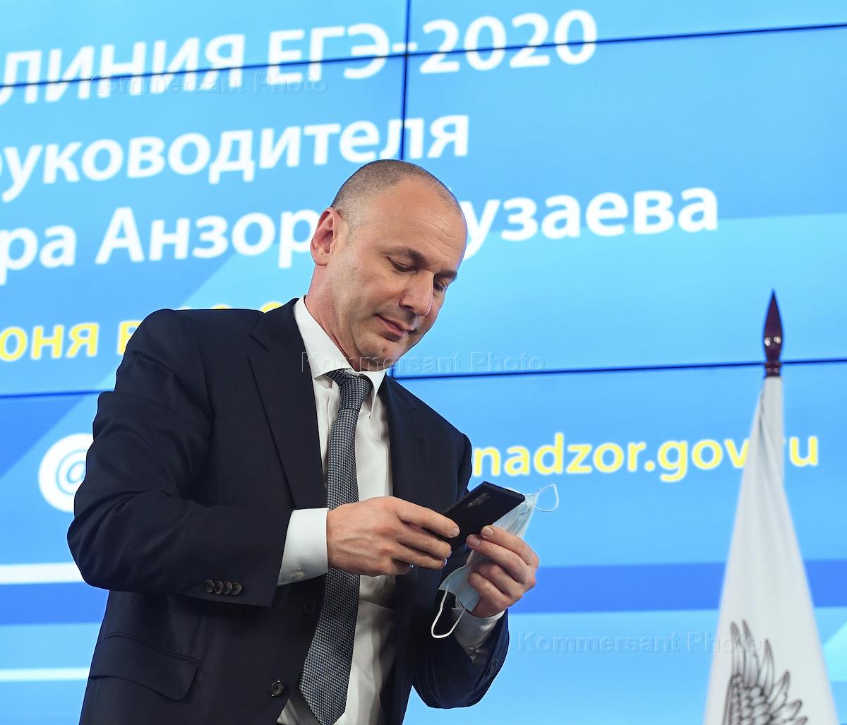 Временно исполняющий обязанности руководителя Федеральной службы по надзору в сфере образования и науки (Рособрнадзор) Анзор Музаев во время прямого эфира по вопросам единого государственного экзамена (ЕГЭ-2020) в условиях пандемии коронавирусной инфекции COVID-19 в ситуационно-информационном центре Рособрнадзора.