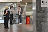 Genre photo. Metro employees wearing face masks talk with a young man at the station.