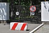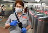 Genre photo. Metro employee with camcorder wearing face mask stand by the turnstiles on the station. The inscription on the badge reading: "CCTV in operation."