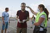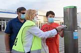 Российская Премьер-лига по футболу. 23-й тур. Матч между командами "Сочи" (Сочи) - "Ростов" (Ростов-на-Дону) на стадионе "Фишт". Сотрудница стадиона во время измерения температуры тела у болельщика перед началом матча.