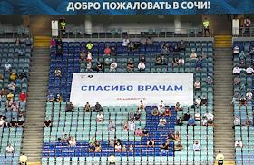 Российская Премьер-лига по футболу. 23-й тур. Матч между командами "Сочи" (Сочи) - "Ростов" (Ростов-на-Дону) на стадионе "Фишт". Надпись на трибуне "Спасибо врачам".