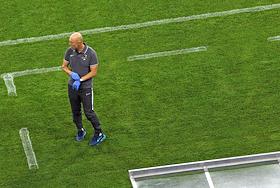 Российская Премьер-лига по футболу. 23-й тур. Матч между командами "Сочи" (Сочи) - "Ростов" (Ростов-на-Дону) на стадионе "Фишт". Болельщики во время дезинфекции рук перед началом матча.