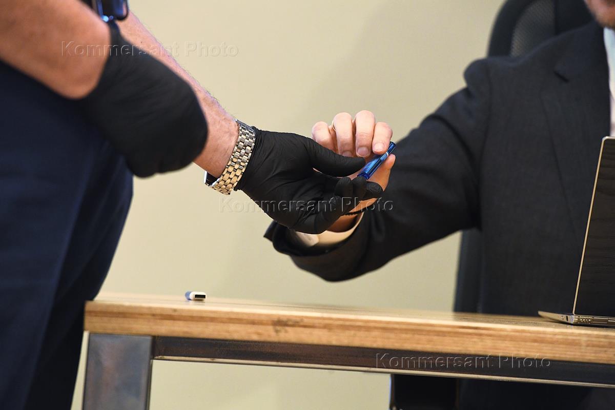 Тестовое дистанционное электронное голосование по внесению изменений в Конституцию России в ЦДП (Цифровое деловое пространство) на улице Покровка. Главный редактор радиостанции "Эхо Москвы" Алексей Венедиктов (слева) во время тестового голосования.