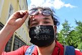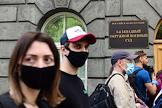 Обстановка около Первого Западного окружного военного суда во время оглашения приговора Юлию Бояршинову и Виктору Филинкову, обвиняемым по ч. 2 ст. 205.4 УК РФ "Организация террористического сообщества и участие в нем" (Сеть). Активисты в защитных медицинских масках возле здания суда.