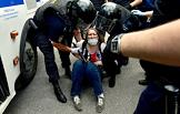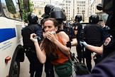 Обстановка около Первого Западного окружного военного суда во время оглашения приговора Юлию Бояршинову и Виктору Филинкову, обвиняемым по ч. 2 ст. 205.4 УК РФ "Организация террористического сообщества и участие в нем" (Сеть). Сотрудники полиции пытаются снять наручники с активиста, который приковал себя к ограде в знак протеста против решения суда. Акционист Павел Крисевич (слева) во время задержания.
