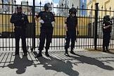 Обстановка около Первого Западного окружного военного суда во время оглашения приговора Юлию Бояршинову и Виктору Филинкову, обвиняемым по ч. 2 ст. 205.4 УК РФ "Организация террористического сообщества и участие в нем" (Сеть). Сотрудники полиции у здания суда.