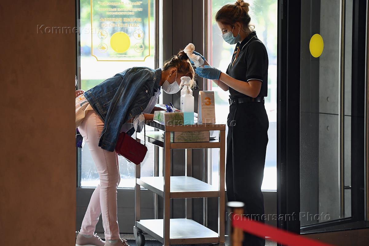 Москва во время отмены режима самоизоляции из-за угрозы распространения коронавирусной инфекции COVID-19. Начало работы ресторана "Макдоналдс" на Пушкинской площади после отмены режима. Посетительница и сотрудник ресторана возле столика со средствами дезинфекции на входе.
