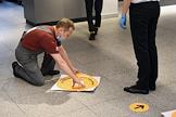Москва во время отмены режима самоизоляции из-за угрозы распространения коронавирусной инфекции COVID-19. Начало работы ресторана "Макдоналдс" на Пушкинской площади после отмены режима. Сотрудник ресторана в медицинской маске во время нанесения разметки безопасной дистанции.