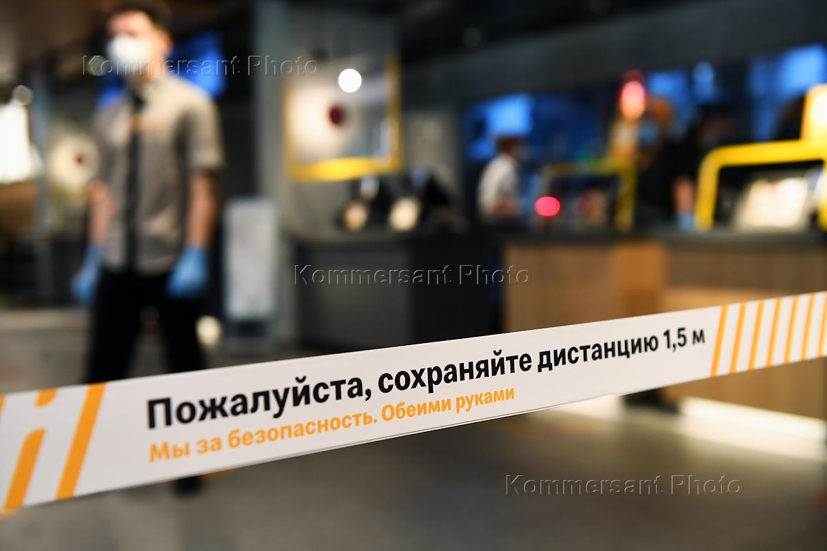 Москва во время отмены режима самоизоляции из-за угрозы распространения коронавирусной инфекции COVID-19. Начало работы ресторана "Макдоналдс" на Пушкинской площади после отмены режима. Лента "Пожалуйста, сохраняйте дистанцию 1,5 метра" в зале ресторана.