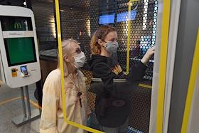 Москва во время отмены режима самоизоляции из-за угрозы распространения коронавирусной инфекции COVID-19. Начало работы ресторана "Макдоналдс" на Пушкинской площади после отмены режима. Посетительницы в медицинских масках у электронного стенда заказа меню.