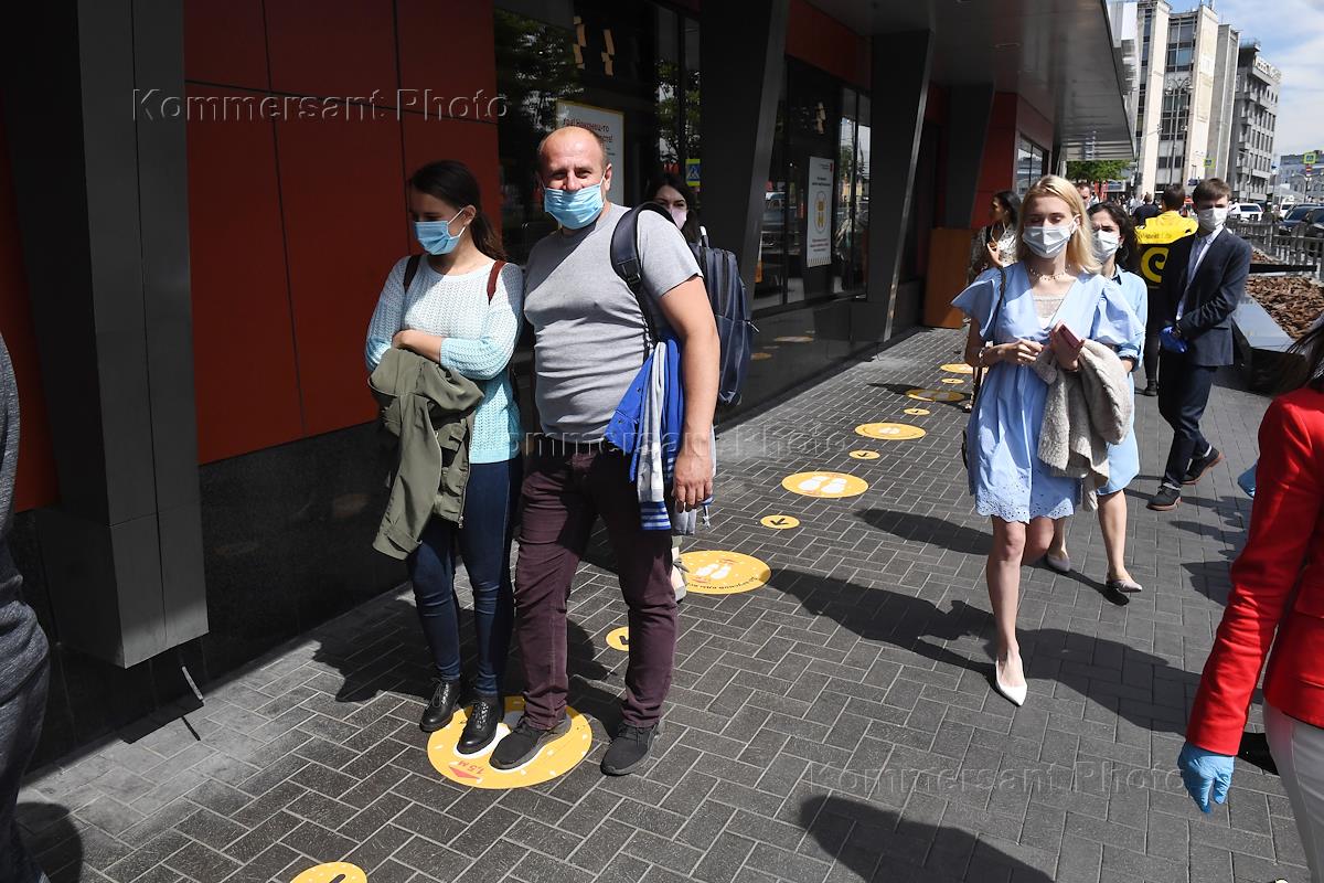 Москва во время отмены режима самоизоляции из-за угрозы распространения коронавирусной инфекции COVID-19. Начало работы ресторана "Макдоналдс" на Пушкинской площади после отмены режима. Посетители в очереди у входа в ресторан.